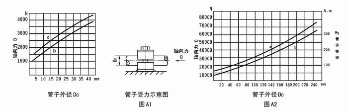 A2 具體內(nèi)容:圖A1 用于“A 系列管夾”;圖A2 用于“B 系列Ⅰ型管夾”。a 曲線表示管夾與管子處于“靜摩擦狀態(tài)”時(shí),管子外徑尺寸與管夾承受管子軸向力的函數(shù)關(guān)系。b曲線表示管夾與管子處于“動(dòng)摩擦狀態(tài)”時(shí),管子外徑尺寸與管夾承受管子軸向力及轉(zhuǎn)矩的函數(shù)關(guān)系。