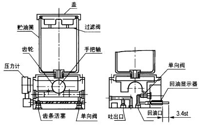 手動潤滑泵是借人工擺動手把,通過齒輪帶動齒條活塞往復(fù)運(yùn)動實(shí)現(xiàn)向外供油的,當(dāng)活塞處于圖示極限位置時,潤滑脂通過吸入口吸入并充滿活塞的右腔,當(dāng)活塞向右移動時,被吸入的潤滑脂在油壓的作用下頂開單向閥壓送至出口向外排出,當(dāng)系統(tǒng)中主分配器的一計量油口返回至回油指示器的油量達(dá)到3.2mL時,指示桿全部伸出,證明系統(tǒng)所有潤滑點(diǎn)已得到所需的潤滑油量,此時停止操作手把并把指示桿向內(nèi)壓進(jìn),為下循環(huán)準(zhǔn)備,指示器內(nèi)的潤滑脂經(jīng)單向閥返回貯油桶內(nèi)。