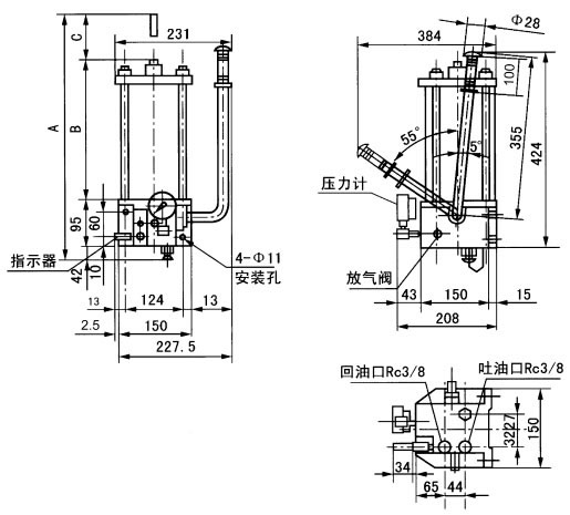 | 六、使用說明 1、手動潤滑泵應(yīng)垂直安裝,泵的上方及周圍要留有指示桿上升及補(bǔ)脂操作的空間。需在室外或環(huán)境惡劣的場合安裝時,應(yīng)將泵置于防護(hù)罩內(nèi)。 2、貯油器內(nèi)無潤滑脂時,不許操縱手柄,至下油位應(yīng)及時補(bǔ)脂。 3、向貯油器內(nèi)補(bǔ)脂,必須使用手動或電動補(bǔ)脂泵從補(bǔ)脂口充填。 4、安全閥出廠已調(diào)至公稱壓力,無故不許隨意調(diào)節(jié)。 5、泵上回油指示器的作用是操作者通過觀察指示器活塞指示桿的運(yùn)動行程,就可知道潤滑系統(tǒng)的供油狀況。使用時,先計算好各潤滑部位所需的給油量,配置分配器,并把主分配器上多設(shè)的一個出油口與手動潤滑泵的回油口接通,使?jié)櫥祷氐街甘酒髦?,如返回的油量累計達(dá)到3.28mL,則指示器的活塞指示桿全部伸出,表示各潤滑點(diǎn)已根據(jù)需要完成一個周期的給油,應(yīng)停止供油并把回油指示器的指示桿推進(jìn)。 | |||||||||||||||||||||||||