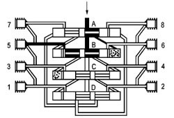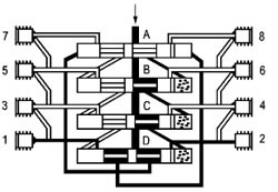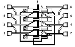 當(dāng)活塞D打通通向活塞A左側(cè)終端的連接通道后,潤滑劑流動并將活塞A向右推動。位于活塞A前右側(cè)的潤滑劑輸送到排出口1。 這時活塞B至D從左側(cè)向右側(cè)運(yùn)動,按以上相反方向順序動作完成一個周期循環(huán)并可重新開始一個新的循環(huán)。