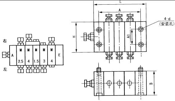 | 說(shuō)明:遞進(jìn)分配器的組合按進(jìn)油口元件首塊A、工作塊M和尾塊E、從左到右排列,在隊(duì)列下方出口稱(chēng)為左,在隊(duì)列上方出口稱(chēng)為右。如圖 | |||||||||||||||||||||||||||||||||||