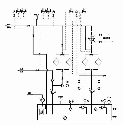 | 本油站為整體式,由油箱、兩臺(tái)低壓油泵、一臺(tái)高壓油泵、二臺(tái)雙筒網(wǎng)片式過(guò)濾器、回油磁網(wǎng)過(guò)濾裝置、列管式油冷卻器、各種控制閥門、管道以及電接點(diǎn)壓力表、鉑熱電阻等組成。 工作原理基本上也和A系列相同;但B系列的低壓油經(jīng)過(guò)過(guò)濾和冷卻后外供時(shí),一部分低壓油通過(guò)旁路再經(jīng)過(guò)一個(gè)雙筒過(guò)濾器后才進(jìn)入高壓泵的吸油口,以提高高壓油的清潔度等級(jí);但應(yīng)注意當(dāng)?shù)蛪汗┯蛯?shí)際壓力較小時(shí)(例如小于0.2MPa時(shí)),由于后一過(guò)濾器同樣也有壓差損失(也隨時(shí)間逐步增大),為保證高壓油泵順利吸入,吸入口應(yīng)始終保證正壓(當(dāng)后過(guò)濾器切換前壓差達(dá)最大時(shí)也必須滿足這一要求);除 流量和A系列有很大不同外,最主要特點(diǎn)(結(jié)構(gòu)特征)為高壓泵吸口前有另一臺(tái)過(guò)濾器。 其他工作原理和操作控制可參見(jiàn)A系列所述。 | |||||||||||||||||||||||||||||||||||||||||||||||||||||||||||||||||||||||||||||||||||||||||||||||||||||||||||||||||||||||||||||||||||||||||||||||||||||||||||||||